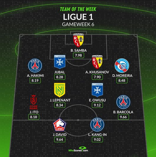 축구 통계매체인 '후스코어드닷컴'은 프랑스 리그1 6라운드 이주의 팀을 공개하였는데요. '이강인'이 9.02로 최전방 공격수 자리를 차지하였습니다.