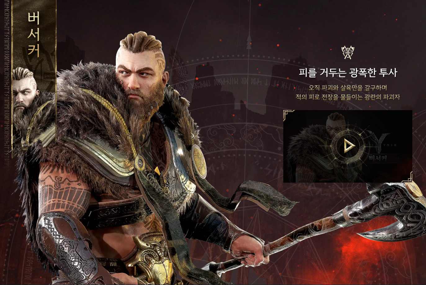버서커(근접 전사), 스칼드(원거리 디버퍼,버퍼), 볼바(원거리 마법사), 워로드(근접 암살자) 로 나눠져있는데요.