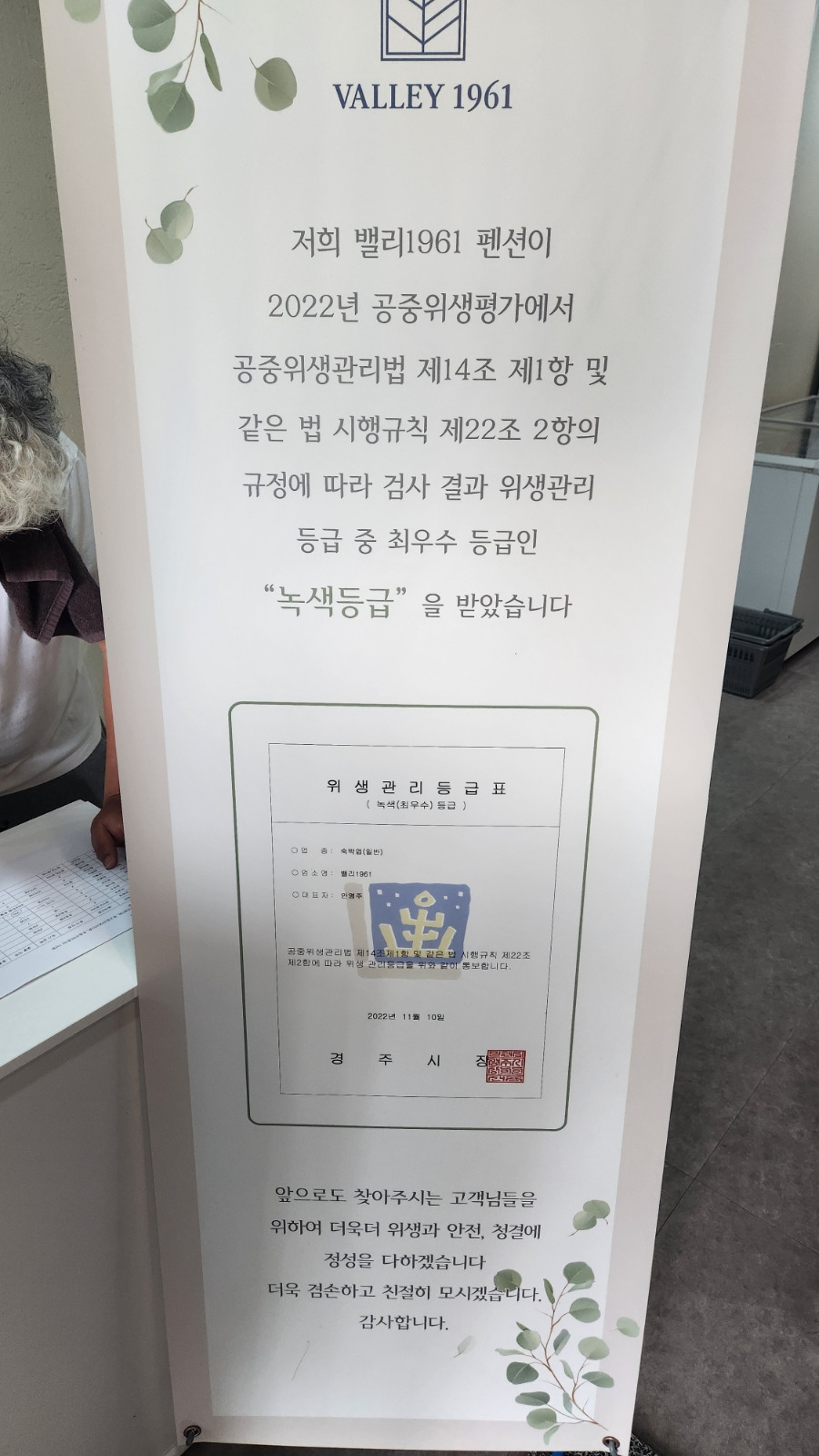 밸리1961은 2022년 위생관리등급 표에서 최우수 등급인 "녹색등급" 을 받을 정도로 위생에 진심인 펜션입니다.