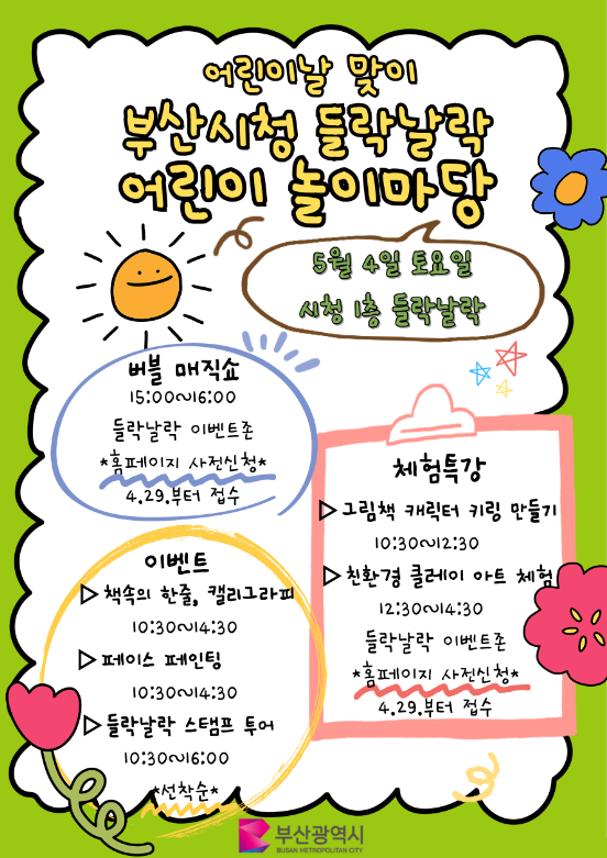 항상 어린이날이 다가오면 고민이 많았던 저로써는 이러한 행사가 너무 마음에 들고, 부산시에서 주관하는 행사라 퀄리티도 나름 신경 썻으리라 생가합니다.