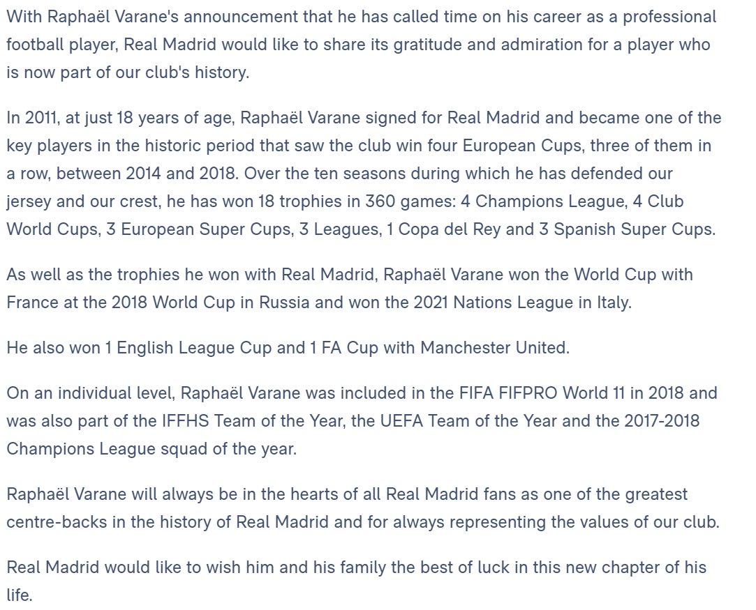 저는 저 자신을 위해, 제 클럽을 위해, 제 조국을 위해, 그리고 제가 함께 뛰었던 팀의 모든 동료들과 그 팀들을 응원해 주신 팬들을 위해 싸우는 것을 사랑했습니다. 랑스에서부터 마드리드, 맨체스터, 그리고 국가대표팀에 이르기까지 저는 모든 엠블럼을 온 힘을 다해 지켜냈고, 그 여정의 매 순간을 사랑했습니다. 최고의 레벨에서의 경기는 정말 짜릿한 경험입니다. 그것은 몸과 마음의 모든 것을 시험하며, 우리가 경험하는 감정은 다른 곳에서는 찾을 수 없습니다. 운동선수로서 우리는 결코 만족하지 않고, 성공을 수용하지 않습니다. 그것이 우리의 본성이며, 우리를 움직이는 원동력입니다.