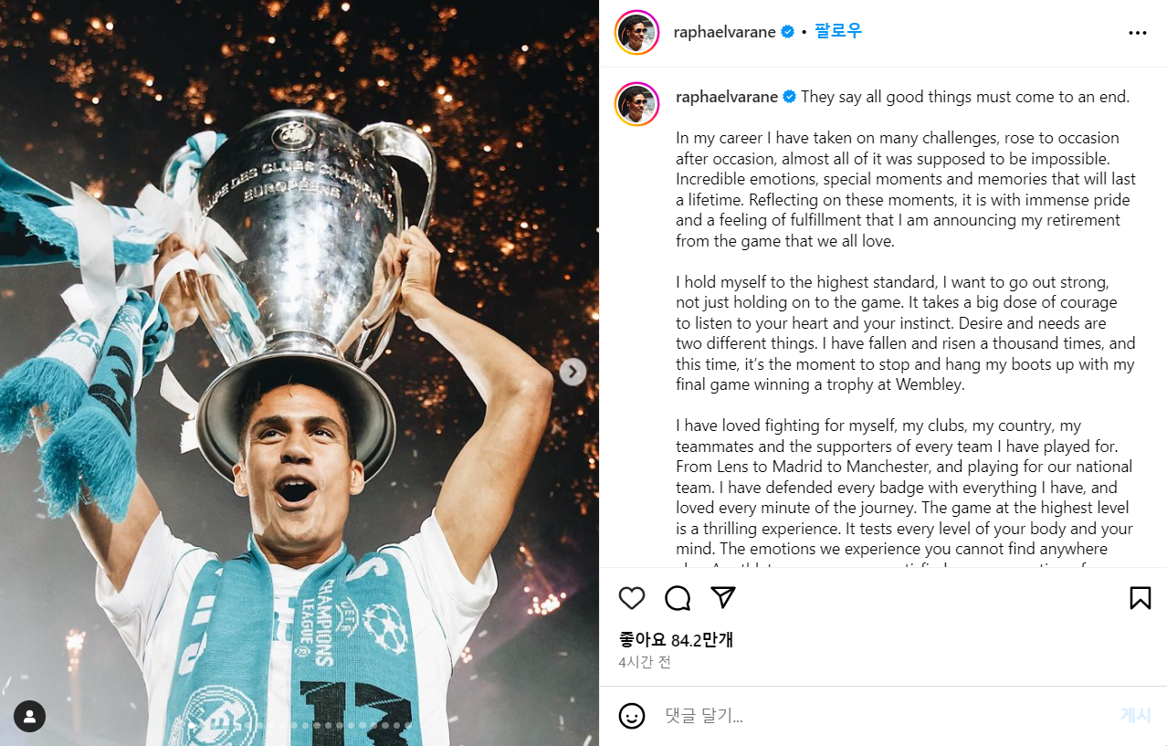 월드클래스 센터백 '라파엘 바란'이 31세의 창창한 나이에 은퇴를 결정했습니다.