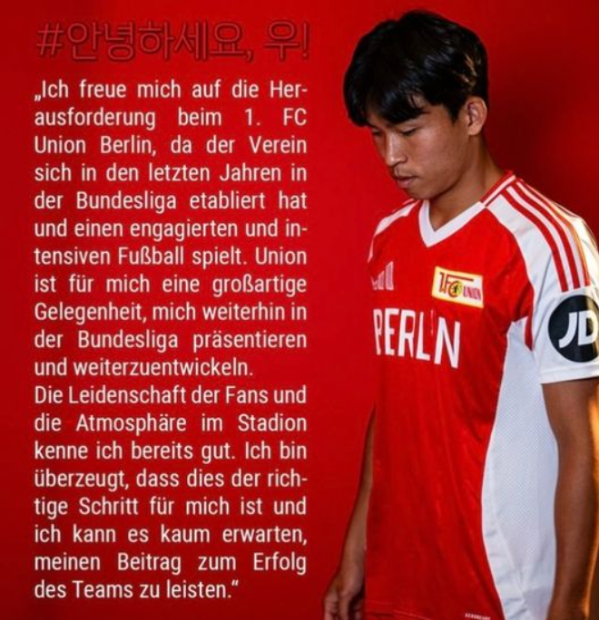 대한민국의 '정우영'(작은 정우영)이 우니온 베를린으로 1 시즌 임대를 떠난다는 소식입니다.