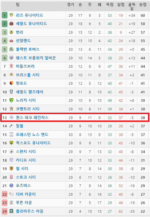 QPR은 축구팬들에게 나름대로 익숙한 팀일 것입니다. 과거에 "해버지" '박지성'이 맨체스터 유나이티드에서 이적한 팀이기도 한데요. 한때 '박지성'을 영입하며 큰 포부를 밝혔던 구단의 자신감과는 다르게 현재의 위치는 챔피언십 13에 머물고 있지요.