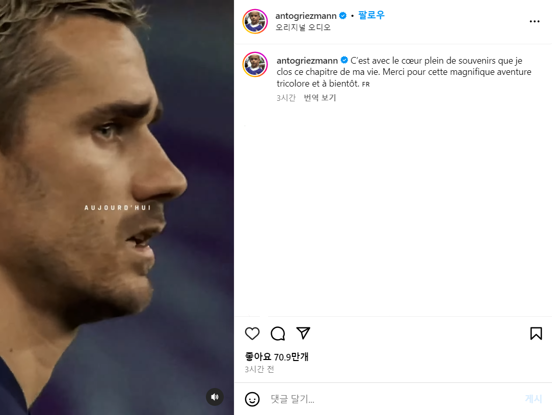 " 프랑스 대표 선수로서 은퇴를 합니다...... 잊을 수 없는 순간들로 가득 찼던 10년을 보낸 지금, 다음 세대를 위해 자리를 내줄 때입니다. 이 유니폼을 입는 건 영광이자 특권이었습니다. 저는 자부심과 감사한 마음을 품고 대표팀을 떠납니다. 우리나라를 대표할 수 있는 영광과 챔피언에 오르는 특별한 순간을 경험했습니다. 저는 계속해서 대표팀을 열정적으로 응원할 것입니다. 다음 세대 또한 밝다고 확신합니다"