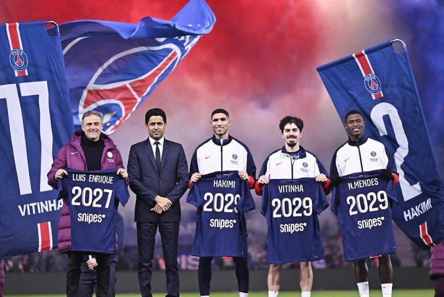 파리 생제르망(PSG)이 핵심 주전 선수들과 감독까지 재계약에 성공했다는 소식입니다. PSG는 한국시간으로 2월 8일 공식홈페이지를 통해 '엔리케'감독과 2027까지의 재계약을, 그리고 '하키미', '비티냐', '멘데스'와 2029년까지 재계약을 발표하였습니다. 이로써 PSG의 주전급 자원 중에서는 '잔루이치 돈나룸마'(2026까지)와 '파비앙 루이즈'(2027년) 밖에 안 남았지요. 대부분 2028년 또는 2029년까지 PSG선수로 뛰게 되었습니다.