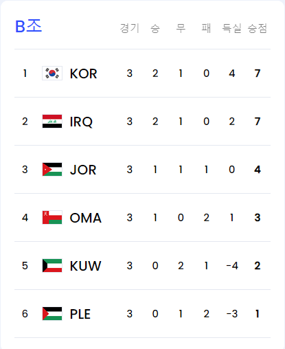 현재 우리나라와 이라크가 2승 1 무로 승점이 같지만 골 득실차로 우리나라가 조 1위를 하고 있는 상황입니다.
