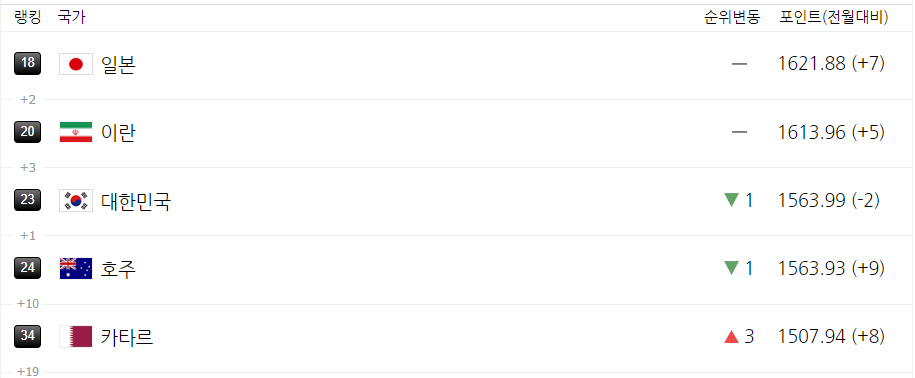 위의 사진을 보시면 현재 아시아에서 일본(18위), 이란(20위)에 이어 대한민국이 23위에 위치하고 있습니다. 24위는 호주인데요. 호주와의 랭킹 포인트가 0.06포인트밖에 차이가 나지 않는 것으로 확인됩니다.