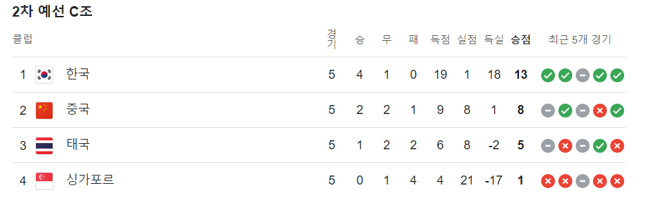 지금 순위를 보시면 우리나라는 뭐 말 안 해도 1위 확정으로 편한 경기를 기다리고 있지만 중국은 태국과의 경기에서 졸전을 면치 못하며 간신히 무승부를 기록해 승점 8점으로 조 2위에 위치하고 있습니다. 만약 태국을 상대로 승리를 가져갔다면 승점 10점으로 무난하게 2위로 다음 예선에 진출할 수 있었는데요. 태국과 비기게 되면서 포지션이 애매한 상황에 놓여 있게 되었지요. 일단 예선 마지막 경기는 우리나라와 중국, 그리고 태국과 싱가포르가 경기를 진행하게 됩니다. 중국은 우리나라를 상대로 승리하기란 쉬운 일이 아니지요. 일단 중국이 우리나라에 패배를 한다면, 승점이 8점, C조 최약 차인 싱가포르를 상대로 태국이 이긴다면??? 승점 8점이 됩니다. 같은 승점에도 득실차에서 중국이 우위를 점할 수 있지만 우리나라가 중국 원정을 가서 2:0으로 승리를 한 전적을 바탕으로 이번에도 대량득점에 성공한다면???? (최소 2점 차) 그리고 태국이 싱가포르를 상대로 2점 차 이상의 승리를 한다면???? 2위 자리는 뒤바뀌게 되는 것이지요.