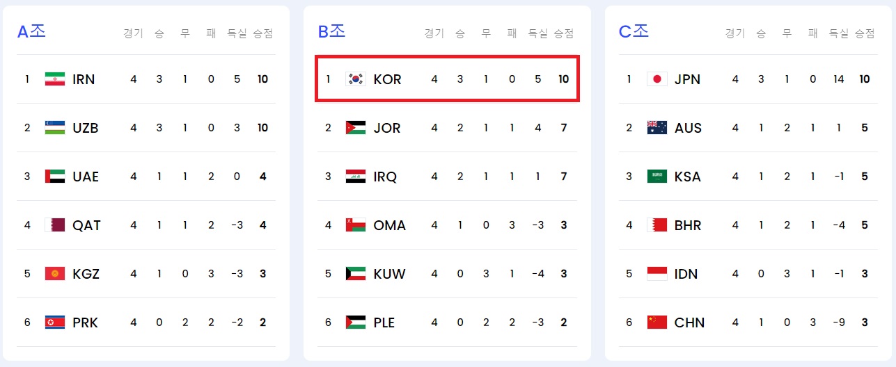 현재 대한민국은 월드컵 3차 예선은 4경기를 치른 가운데 3승 1무 (승점 10점)으로 B조 1위를 달리고 있습니다.
