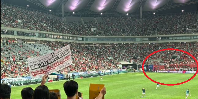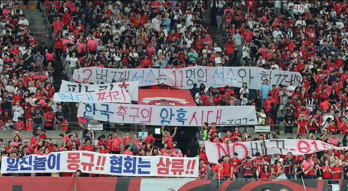 관중들은 경기 시작 전부터 플랜카드를 내어 걸고 아유를 퍼붓고 기존의 붉은악마 응원 플랜카드를 거꾸로 거는 등 홈경기에서는 있을 수 없는 상황이 연출되기도 했습니다.