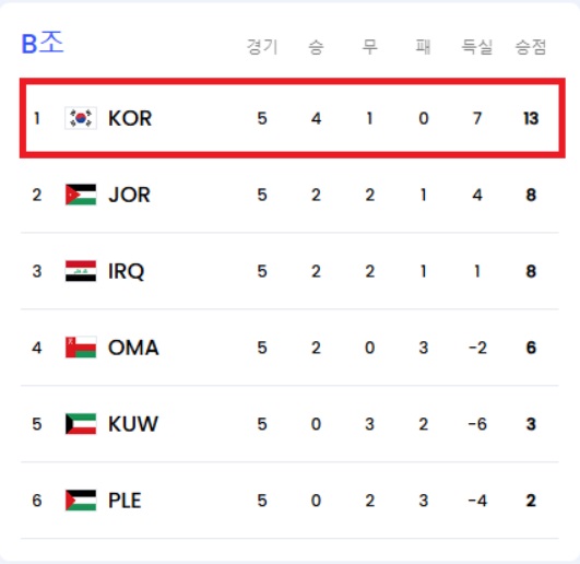 이번 쿠웨이트 전으로 절반의 경기를 치렀고 현재 팔레스타인과의 무승부를 제외하고는 대한민국은 2골 이상씩 꾸준히 기록하며 경기를 승리하였습니다. 남은 경기도 선수들의 별다른 부상 이슈가 없는 한 큰 문제없는 경기가 진행될 텐데요.