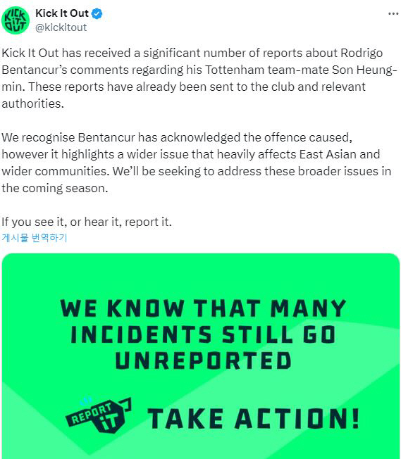 이렇게 사건이 유야무야 하는줄 알았으나 차별금지 자선단체인 국제단체 킥인아웃(Kick it out)이 나서면서 분위기는 점점더 불타오르게 됩니다. 킥잇아웃(Kick it out)은 20일 "우리는 벤탄쿠르가 손흥민에 대해 언급한 내용에 대해 상당수의 제보를 받았다. 이에 관한 보고서는 이미 클럽과 관련 당국에 전달됐다. 우리는 벤탄쿠르가 잘못을 시인했다는 것을 인정한다. 그러나 이는 동아시아 및 더 넓은 지역사회에 큰 영향을 미치는 문제다. 우리는 다음 시즌에도 이러한 광범위한 문제를 해결하기 위해 노력할 것" 이라고 발표하면서 한국을 넘어서 세계가 주목하는 사건이 되어버린것이지요.