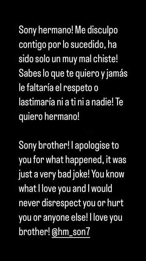 앞선 행동으로 인해 사태가 심각해 지자 '벤탄쿠르'는 곧바로 사과문을 작성합니다. '벤탄쿠르'는 SNS에 "쏘니 내 형제여! 너에게 일어난 일에 대해 사과할게. 그건 매우 나쁜 농담이었다!" "내가 널 사랑하고, 너를 존중하지 않는다거나 너와 다른 사람들을 상처 입히려고 했던 게 절대 아니라는 걸 알아줘! 사랑해 내 형제!" 라며 '손흥민' 계정을 태그해 사과했는데요.