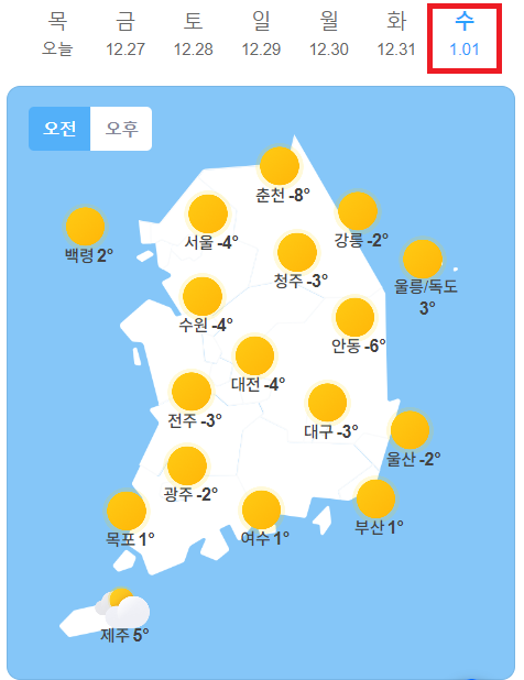 그리고 작성 시간 (12월 26일) 기준으로 1월 1일 날씨를 확인해 보니 제주도 제외 전부 맑은 이더군요!!!