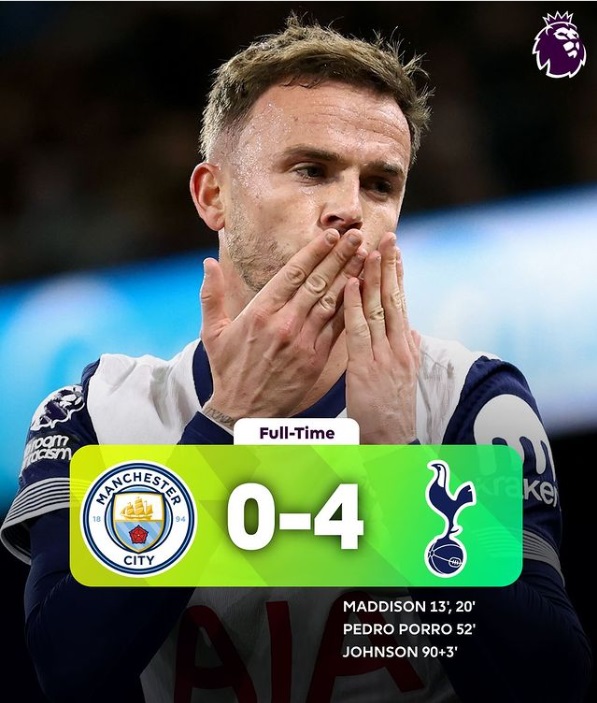 특히나 '매디슨'의 추가골은 '손흥민'의 패스와 '매디슨'의 슈팅 모두 환상적이었습니다. '손흥민'의 슈팅 모션에 맨시티의 수비진이 속았고 그 패스를 받은 '매디슨'은 가벼운 칩샷으로 득점에 성공했으니 말이지요.