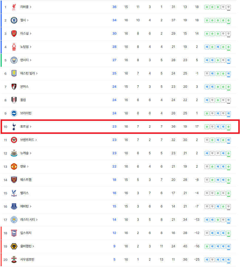 그리고 토트넘은 프리미어리그에서도 10위로 올라섰습니다.