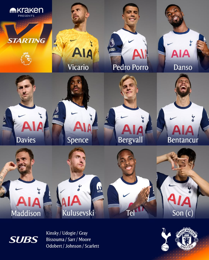 이번 맨유전 토트넘 선발라인업에는 반가운 얼굴이 몇 보였습니다. 얼마전 큰 부상으로 장기간 결장한 '비카리오'가 돌아왔습니다.