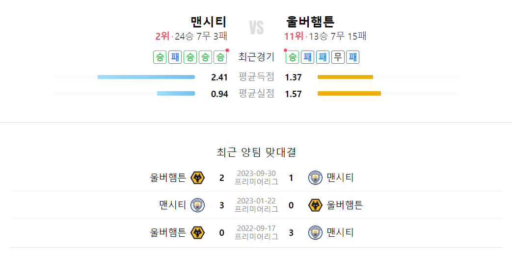 최근전적으로 봤을때는 맨체스터시티가 2승 1패로 우세한 상황입니다. 또한 프리미어리그 순위도 봤을때 객관적인 전력은 맨체스터 시티가 울버햄튼보다 명확히 앞서있는게 보이죠. 하지만 직전경기만 놓고 따져 봤을때 울버햄튼이 맨체스터시티를 상대로 승리를 하였기 때문에 이번 경기는 어떤식으로 흘러갈지 잘 모르겠네요.