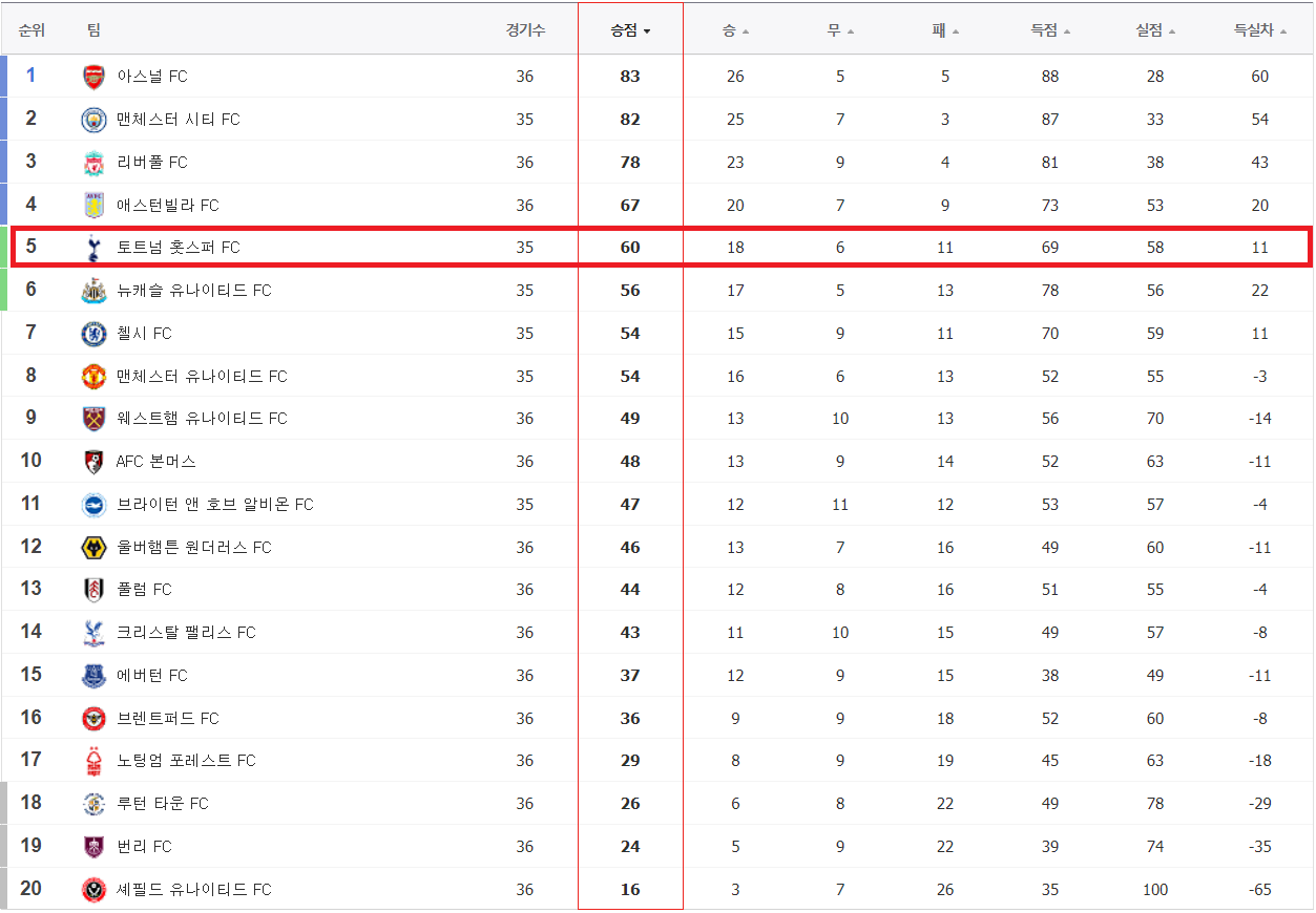 현재 토트넘은 프리미어리그 5위에 위치하고 있습니다. 게다가 아래있는 팀들과의 승점 차이도 얼마 나지 않고 있지요.