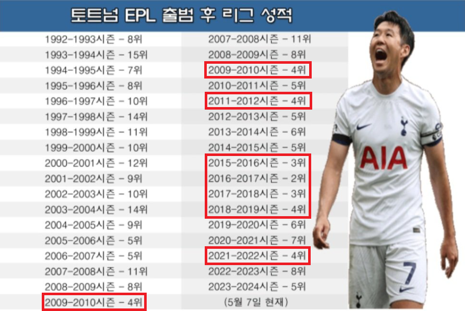 하지만 5위로 마감을 했다 하더라도 마냥 슬퍼할 문제는 아니라고 봐요. 토트넘이 사실상 EPL TOP4에 항상 위치해 있는 팀도 아니었고, 역대 프리미어리그 출범 후 토트넘이 4위안에 들어갔던 적이 8번밖에 없습니다.