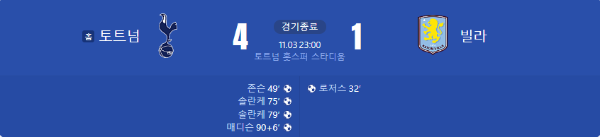 비록 전반전에는 토트넘이 선제골을 먹히며 무기력한 모습을 보여주었지만 '존슨'의 골을 시작으로 '솔란케'의 멀티골 그리고 '매디슨'의 프리킥 골로 깔끔하게 빌라를 잡으며 리그 순위를 조금 끌어올렸습니다.
