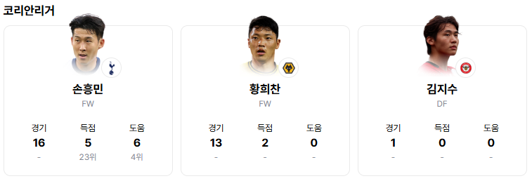EPL에서 뛰고 있는 코리안리거들을 살펴보면 '손흥민'은 이번 전반기 햄스트링 부상으로 인해 경기출전에 제약을 받았고 그 결과 5 득점에 도움 6개로 아쉬운 공격 포인트를 기록하였습니다. 물론 저 수치도 대단한 수치이긴 하나 지금까지의 '손흥민'의 폼에 비하면 다소 아쉬운 느낌이 드는 건 어쩔 수 없지요.