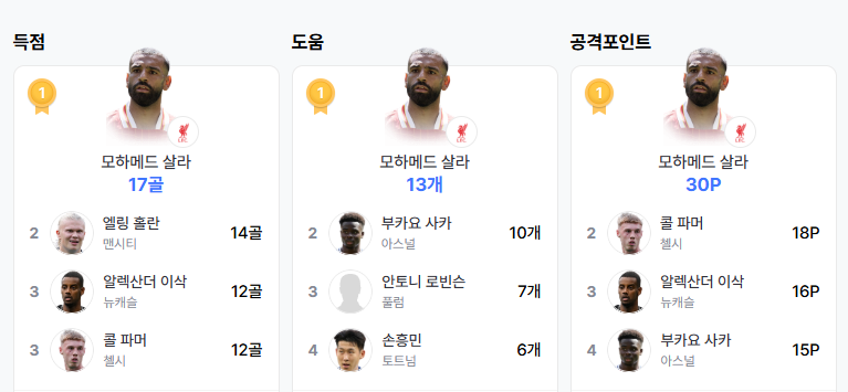 그리고 선수 개인기록을 살펴보면 말이 안나옵니다. '모하메드 살라'가 모든 개인 스텟에서 1위를 달리고 있네요.....