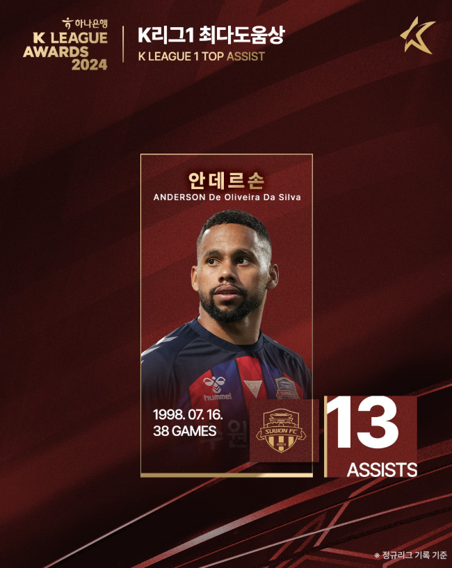 K리그 도움왕은 이번에 수원 FC소속의 '안데르손'이 수상하게 되었습니다. '이승우'가 전북으로 떠나면서 수원 FC에 커다란 공백이 생기지 않을까 걱정했으나 '안데르손'이 그 빈자리를 잘 메꿔주며 팀의 최전방 공격수 자리를 완벽히 수행하였습니다. 그 결과 도움왕이라는 개인 타이틀을 획득할 수 있었지요. '안데르손'은 '이승우'가 수원 FC에 있을 시절 팀 내 최고의 콤비라 할 만큼 호흡이 좋았는데요. 다음 시즌 '안데르손'과 함께 수원의 공격을 책임질 선수는 누가 될지 기대가 됩니다.