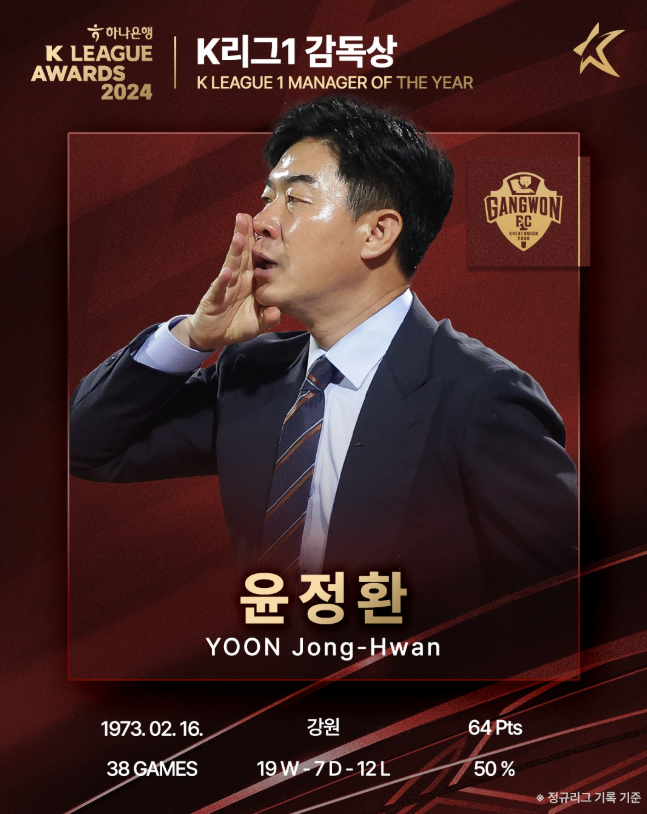 K리그 1 감독상은 강원 FC의 '윤정환' 감독이 수상하였습니다. 보통 감독상 같은 경우는 우승팀에서 수상하는 경우가 많은 데요. 아무래도 우승팀인 울산 HD '김판곤' 감독 같은 경우 시즌 도중에 부임하면서 '홍명보' 감독이 절반정도 이뤄낸 것을 이어받은 경우라 이번 감독상은 2위인 '윤정환' 감독에게 돌아간 게 아닌가 싶네요.
