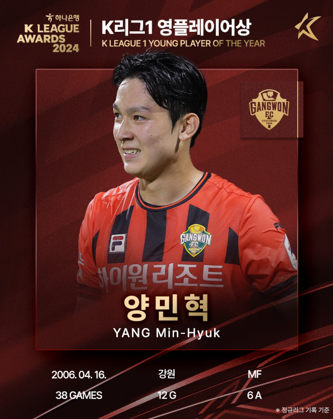 '양민혁'은 '김민재' 이후 1년 차가 영플레이어 상을 받는 영광을 누렸네요. 최초는 '김민재'였다니.... 역시 '양민혁'이나 '김민재' 정도는 되야 1년차 영플레이어상을 받을 수 있는가 봅니다. ㄷㄷ