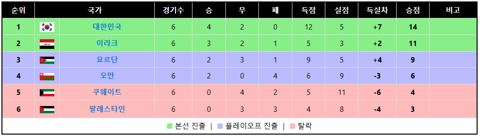 현재 대한민국은 6경기 4승 2 무로 승점 14점을 획득하며 조 1위를 달리고 있습니다. 만약 이번에 열리는 예선전 2경기를 모두 이길 경우 남은 경기에 상관없이 본선진출을 조기 확정합니다.