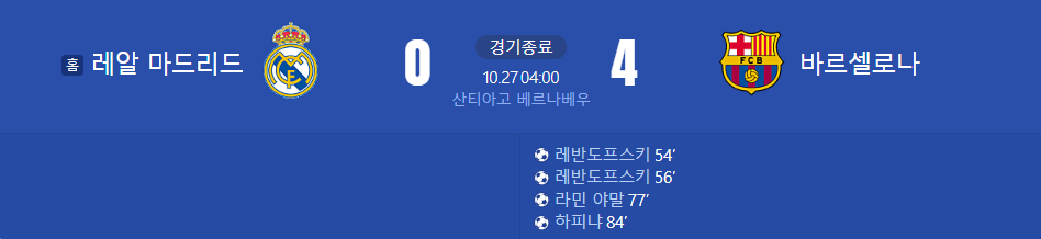 이전의 엘클라시코에서는 레알 마드리드가 바르셀로나를 홈에서 3-2로 승리를 하였지만 이번에는 결과가 완전히 달랐지요. 무려 바르셀로나가 레알 마드리드의 홈에서 4골을 몰아치며 승점 3점을 가져갔습니다.