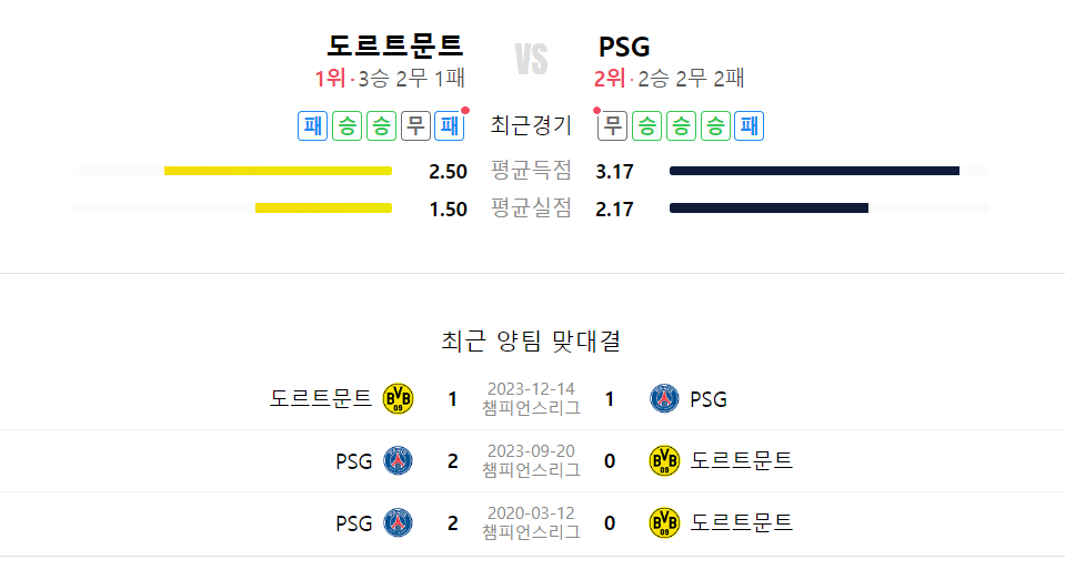 최근맞대결에서 도르트문트가 파리생제르망에 1무2패로 뒤쳐기긴 하지만 여러가지 통계자료에서 볼수 있듯이 무시할수없는 팀이고 또한 이번 준결승전1차전은 도르트문트홈에서 경기를 하니 파리생제르망 입장에서는 결코 유리한 상황은 아닐겁니다. 하지만 파리생제르망에는 확실한 키플레이어인 '음바페'가 있고 나름 친정팀 킬러인 '뎀벨레'까지 가세한다면 파리생제르망이 시원시원한 득점을 보여주지 않을까 예상되네요.