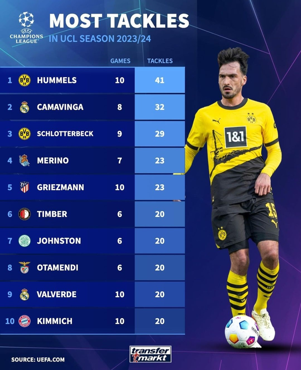 첫번째로 가장많은 태클을 성공한 선수들의 순위입니다. 이번 챔피언스리그에서 가장 많은 태클을 성공시킨 선수는 10경기 41회로 '마츠 훔멜스'가 1위를 차지하고 있고 같은팀 '니코 슐로터백'이 3위를 하고있습니다. 도르트문트에서 2명이나 태클 성공횟수 5위안에 위치한걸로 보아 수비력이 정말로 좋은 팀이라는것은 확인할 수 있습니다.