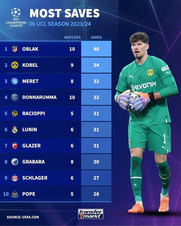 다음으로 골키퍼의 선방 기록입니다. 1위는 아틀래티코 마드리드의 '오블락'이 차지하였고 뒤를 이어 도르트문트의 '그레고리 코벨'이 34회로 2위를 차지하였습니다. 아틀래티코 마드리드는 이미 토너먼트에서 탈락을 하였고 만약 도르트문트가 결승전까지 올라간다면 선방횟수 1위자리까지 차지할 수 있지 않을까 싶네요.