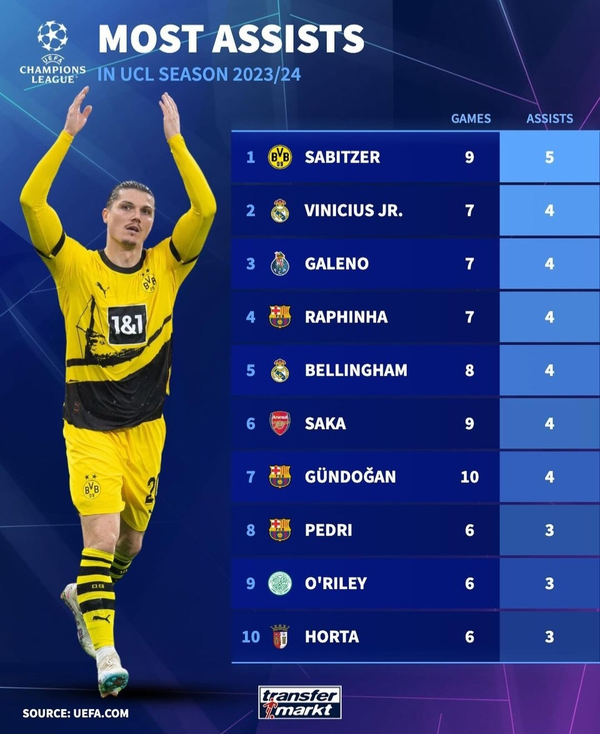 다음으로 조사된 통계는 어시스트순위입니다. 역시 도트르문트의 '마르셀 자비처'가 9경기 5개로 1위를 차지하였지요. 심지어 '자비처'는 이번시즌에 합류한 신인이라는거 !!! 알짜배기로 영입을 잘한 선수가 아닐까 싶습니다.
