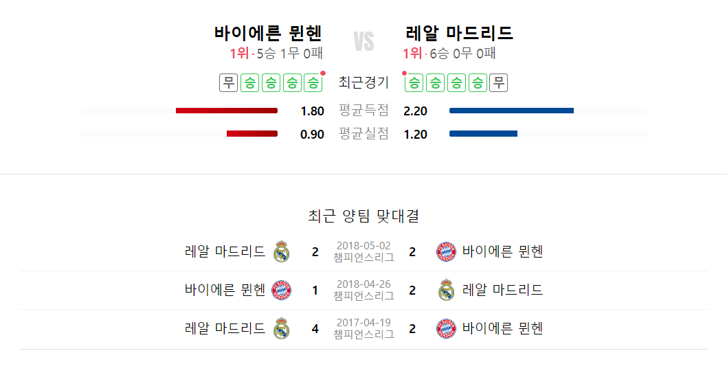 최근 전적을 보면 뮌헨이 1무 2패로 레알마드리드에게 다소 밀리는 모습이 눈에 들어오는군요.