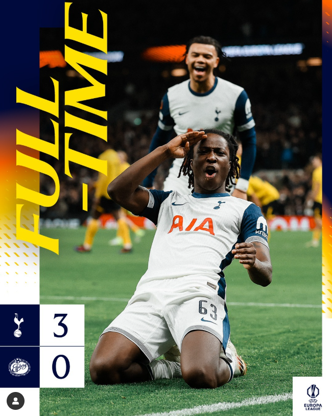 또한 이번 경기 3-0 승리에 이바지를 한 젊은 선수들이 있습니다. 이번에 올린 3개의 득점 모두 어린 선수들이 이루었습니다. 임대를 가서 실패한 후 재임대를 위해 팀에 복귀한 '스칼렛'이 선제골을 기록하였고, 뒤를 이어 교체해 들어온 '아자이'가 추가골을, 마지막으로 토트넘이 공들여서 키우고 있는 '마이키 무어'가 쐐기골을 기록하였습니다. 전부 교체선수였고 전부 나이가 어린 선수라는 점을 본다면 토트넘의 미래는 밝다(?) 고 할 수 있겠는데요????