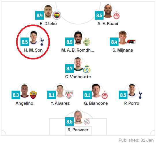 이번 경기에서는 '손흥민'이 45분 만을 뛰었음에도 불구하고 소파스코어에서는 평점 8.5점을 부여하며 팀 내 최고 평점을 주었습니다. 그러면서 유로파 리그 이주의 팀에도 선정되는 쾌거를 이루었지요.
